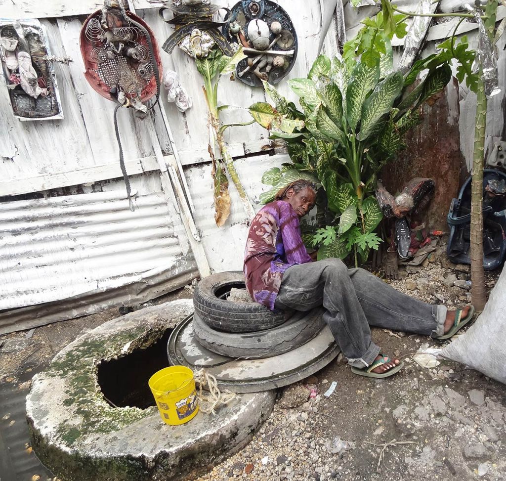 For the 4th Ghetto Biennial, themed KREYÒL, VODOU and the LAKOU : forms of resistance, we started looking closely at plant relationships. We decided to kick off the project with a shared meal of Tchaka, a three-sisters porridge made of crushed corn, beans and heirloom squash traditionally prepared to honor Azaka, the patron of Agriculture. Rose Marie prepared the meal in Lakou Claude with the help of Papouche and Anna Sebastian. During the preparation, a gentle breeze picked up and tossed one of Claude’s sculptures right on top of the covered pot of simmering stew. It was felt this was Azaka’s gesture of acknowledgement for our efforts, offering a joyous start to the collaboration. The shared meal was attended by a well-balanced group of foreign and Haitian artists. It spurred Rossi Jacques Casimir to instigate a spontaneous spoken word performance with several of his Timoun understudies. This gathering opened us to the idea that Claude’s space could be used as a platform for actions and creative engagements as much as an exhibition space for static artworks. There ended up being quite a few artists drawn to this more dynamic practice which bore many fruitful interactions. Claude was ever full of grace in how he welcomed ideas and provided the space both literally and conceptually for us to delve into understanding the extraordinary ecological relationships expressed in Haiti.