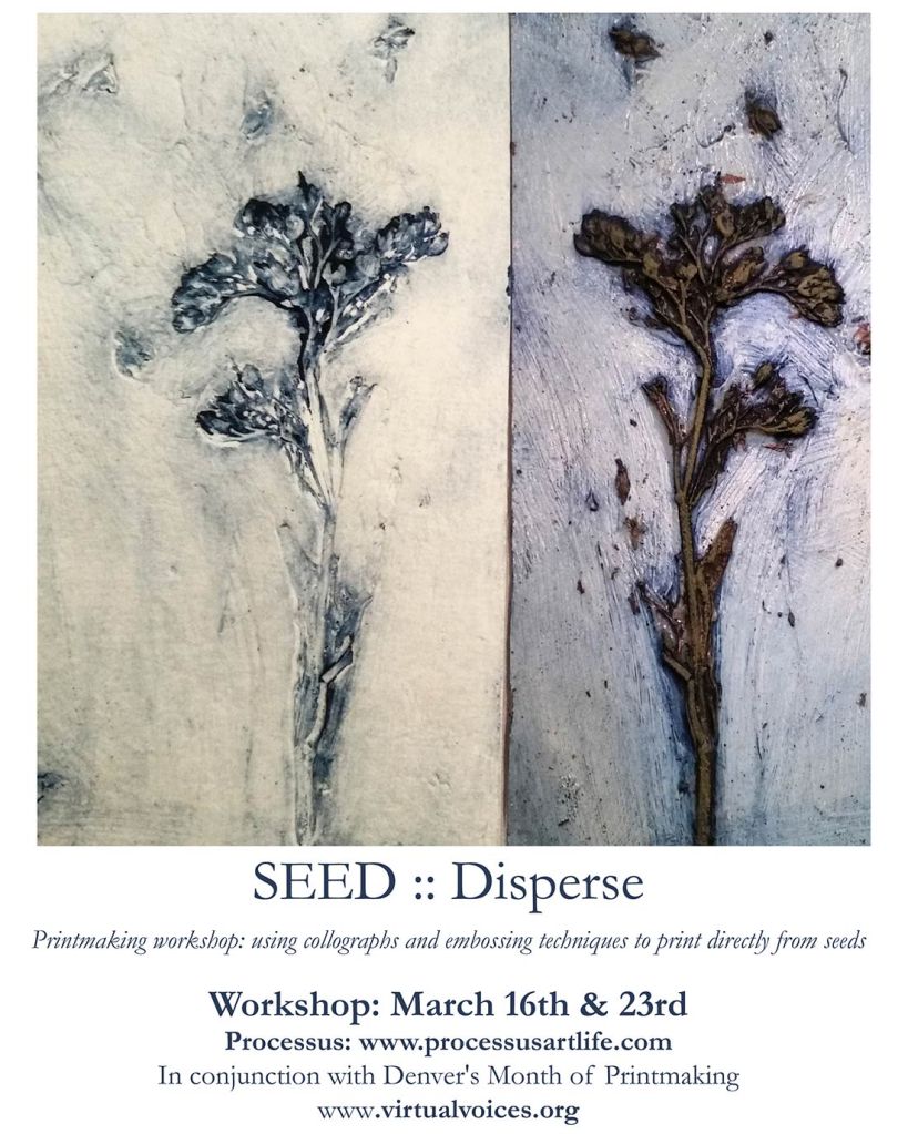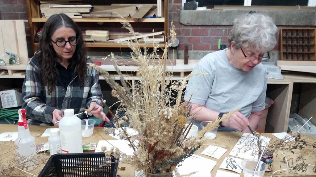In conjunction with Denver’s Month Of Printmaking, we hosted a seed-head printmaking workshop using seeds affixed to cardstock so that when run through the press, it printed with an embossed texture and fine details of the plants. The first session was dedicated to making the plates, and the second was for printing both fixed plates and monoprints using loose plants.