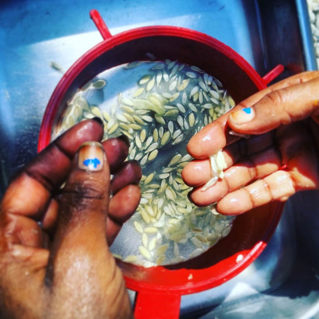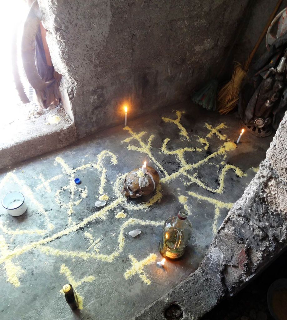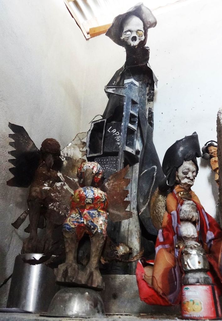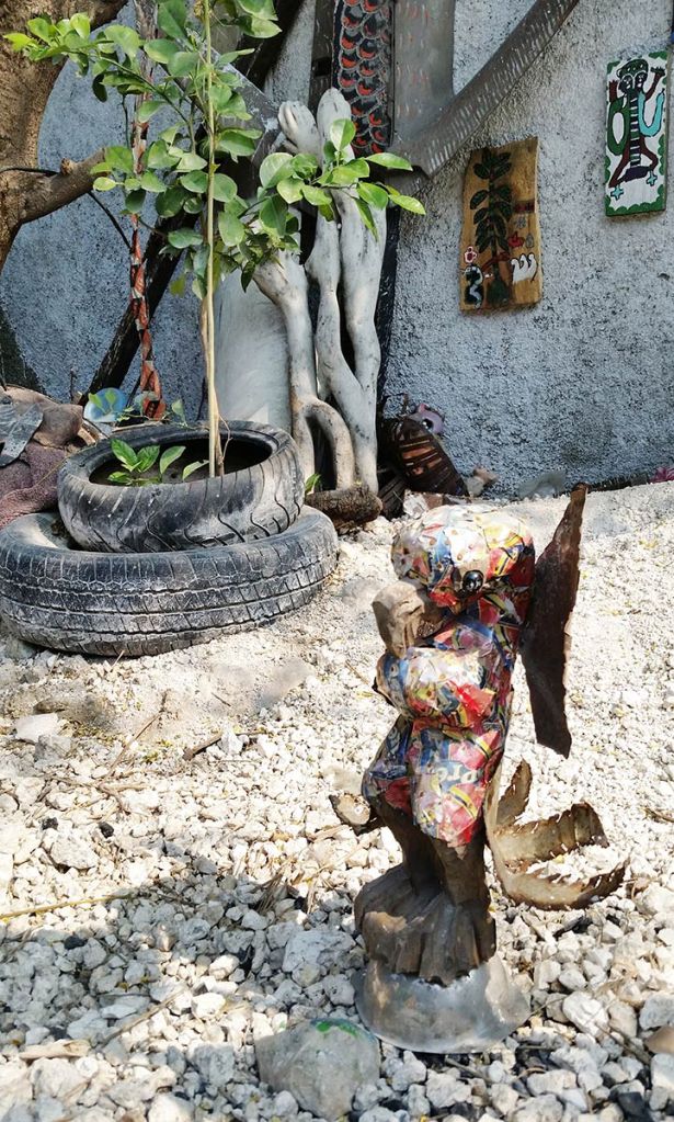 As we dispersed saplings, we gathered ecological artworks which we brought to Claude, who in turn would smile at every chosen item before placing it carefully in his shrine room. He wove together the collection in ways that were dynamic; dispersing energy as much as collecting objects, echoing ways wild-crafters will replenish the landscape as they progress in gathering. The staff moira made for her performance was prominently displayed along with the cross that Claude carried during the Ra-Ra performance that opened the Biennial final weekend. Along with various fruits from the market, we saved seeds from the shared meal that was prepared by a group of neighborhood women that year. We researched how to germinate various fruit seeds that were ripening around the neighborhood and set up demonstration grounds with Claude in his garden. Saved seeds were stored in clay vessels that were interspersed with sculptures on his shrine as an offering both to the sacred representations therein, and also to community members to try cultivating in their pocket gardens.