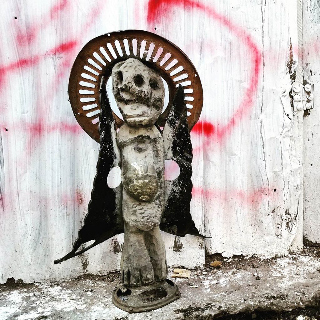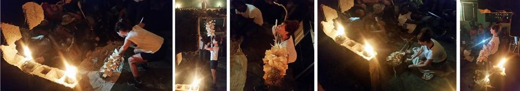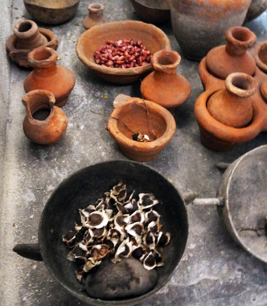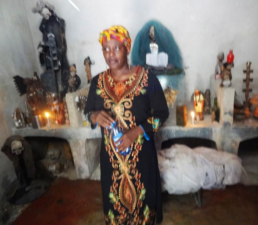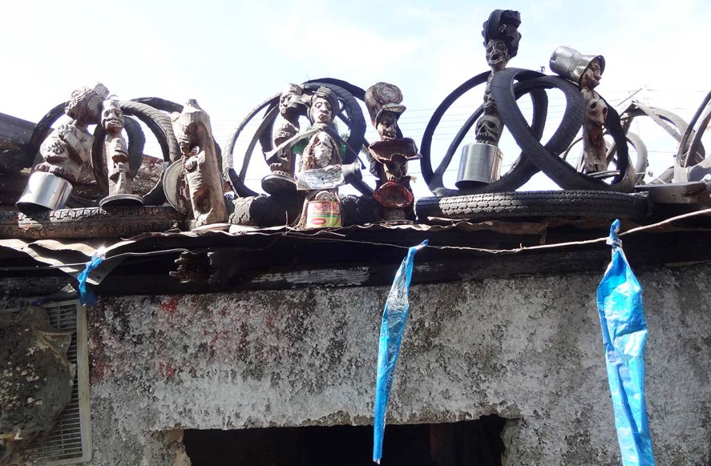 As we dispersed saplings, we gathered ecological artworks which we brought to Claude, who in turn would smile at every chosen item before placing it carefully in his shrine room. He wove together the collection in ways that were dynamic; dispersing energy as much as collecting objects, echoing ways wild-crafters will replenish the landscape as they progress in gathering. The staff moira made for her performance was prominently displayed along with the cross that Claude carried during the Ra-Ra performance that opened the Biennial final weekend. Along with various fruits from the market, we saved seeds from the shared meal that was prepared by a group of neighborhood women that year. We researched how to germinate various fruit seeds that were ripening around the neighborhood and set up demonstration grounds with Claude in his garden. Saved seeds were stored in clay vessels that were interspersed with sculptures on his shrine as an offering both to the sacred representations therein, and also to community members to try cultivating in their pocket gardens.