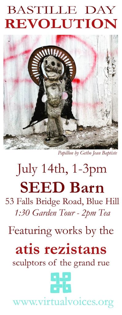 Sculptures by Atis Rezistans members are installed through the gardens around the SEED Barn and will remain on view through the summer. The sale of these artworks will directly support continued restoration efforts in the central urban zones of Port-Au-Prince. The SEED Barn in Blue Hill Falls was built by the ship builder, John Cheever, who constructed tall ships in Conary Cove. It is also located at mulatamicuwon, traditionally used by the Penobscot. The history which has unfolded in this place makes it a relevant platform to explore the ties between seemingly disparate geographies.