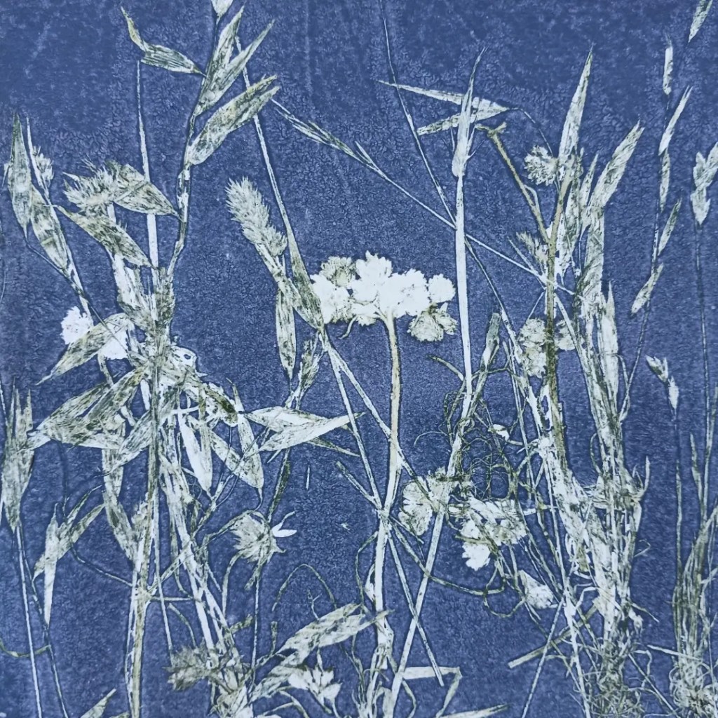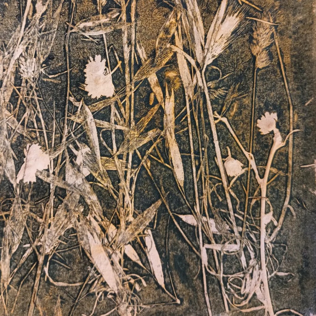 As we explored the living history of Acequias in the Rif, we collected plants that thrived along the networks of waterways and outcroppings in the area. Our studio time was focused on making impressions of these plants on the press provided by Green Olive Arts. Instead of making individual plates, we placed a piece of plexiglass atop the press bed, on which we inked directly before arranging plant material then paper.