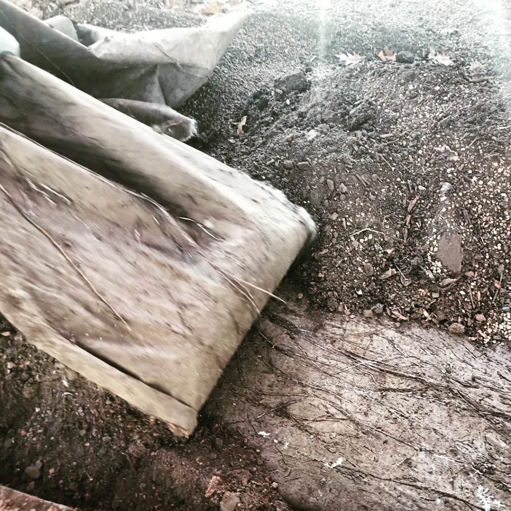 By December, leaves from the existing oak have largely fallen, offering nitrogen rich leaves to decompose, loosen the clay and fertilize the soil. When we go out to choose stone to install in the spring, we pick up a load of mulch to tuck around the bushes that we had planted with Grace in the early 1990’s. We celebrate their capacity to hold on despite the dry, stifling conditions they were subjected to for decades. At this point we let the ground rest.