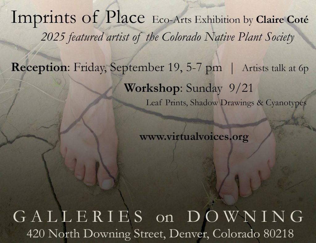 On Friday, September 19, 5-7 pm, all are invited to a reception to celebrate Imprints of Place & Plants in Denver; a brief artist talk will be presented at 6 pm. Imprints of Place & Plants is hosted by restoration artist and instigator, Lee Lee who has recently opened the GALLERIES on DOWNING in a lovingly restored Victorian Farmhouse located at 420 Downing Street, in the Alamo Placita Historic Neighborhood. The exhibition opens in conjunction with the Colorado Native Plant Society’s Annual Conference in Denver, September 20-21, which will feature Claire’s work and a collaborative native plant workshop at 420 Downing Sunday afternoon.